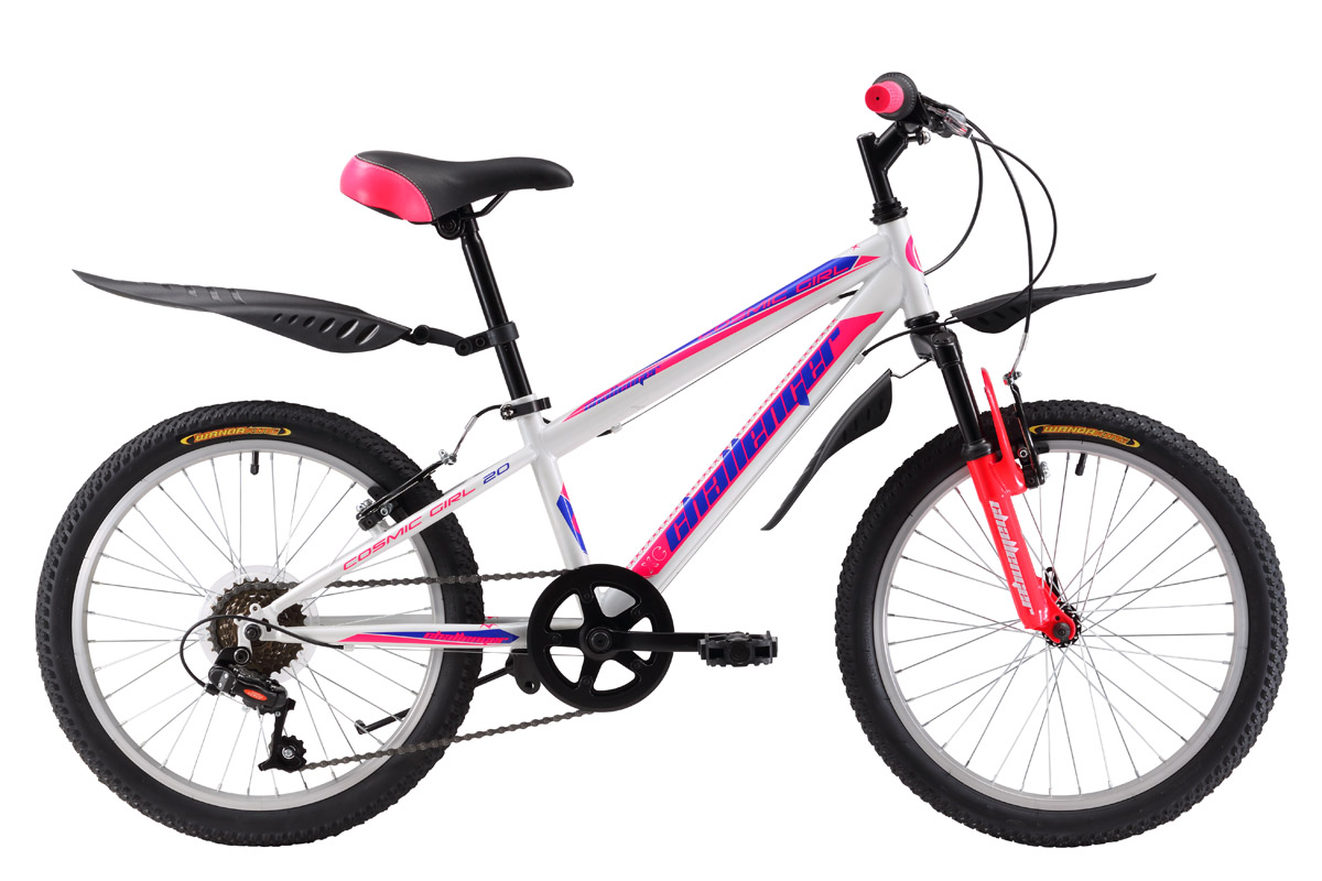 • Велосипед Challenger Cosmic Girl 20 предназначен для девочек ростом от 115 до 127см. Challenger Cosmic Girl 20 собран на прочной стальной раме и имеет 6-скоростную трансмиссию. Ободные тормоза типа V-brake надёжно работают и просты в обслуживании. Колёса крепятся в вилке эксцентриком, который позволяет с лёгкостью снять колёса при погрузке в автомобиль. Производитель представил модель в двух стильных цветах - белом и розовом, наиболее подходящих девочкам. Велосипед Challenger Cosmic Girl 20  укомплектован удобными пластиковыми крыльями и подножкой.